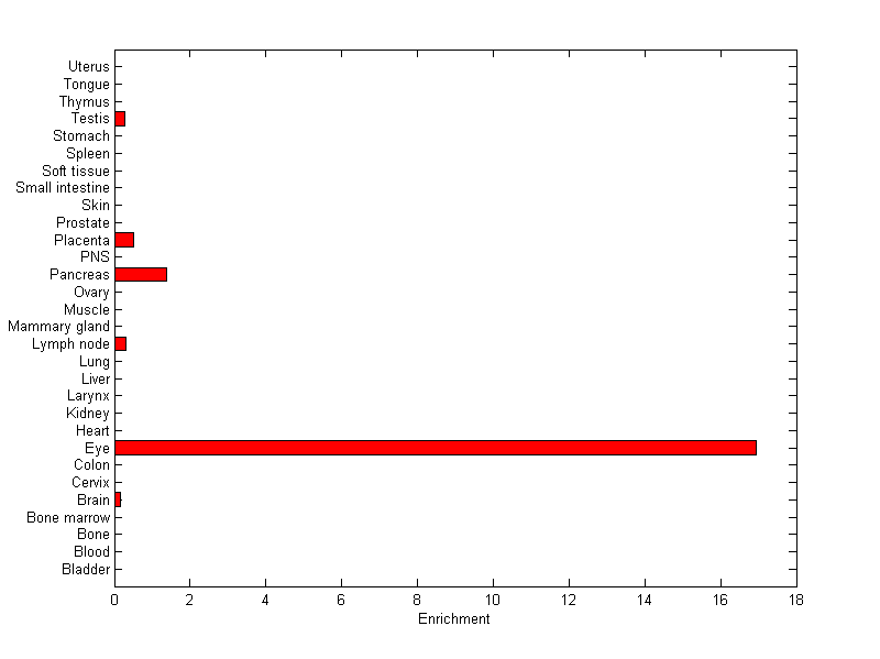 The expression level is normalized with tissue-library size. Each value for a gene in a tissue is a ratio of observed ESTs to the expected one in this tissue. The expected number of ESTs is the product of total ESTs of the gene and the fraction of total ESTs in the tissue among all ESTs in 30 tissues.