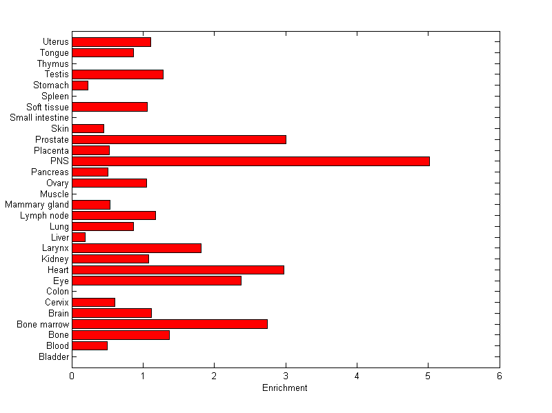 The expression level is normalized with tissue-library size. Each value for a gene in a tissue is a ratio of observed ESTs to the expected one in this tissue. The expected number of ESTs is the product of total ESTs of the gene and the fraction of total ESTs in the tissue among all ESTs in 30 tissues.