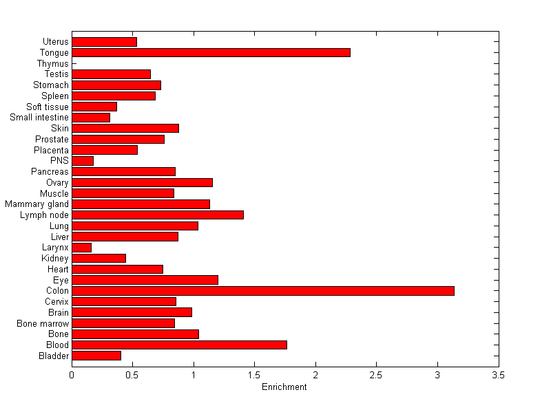 The expression level is normalized with tissue-library size. Each value for a gene in a tissue is a ratio of observed ESTs to the expected one in this tissue. The expected number of ESTs is the product of total ESTs of the gene and the fraction of total ESTs in the tissue among all ESTs in 30 tissues.