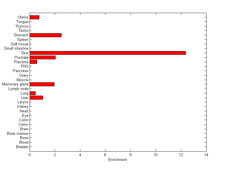 The expression level is normalized with tissue-library size. Each value for a gene in a tissue is a ratio of observed ESTs to the expected one in this tissue. The expected number of ESTs is the product of total ESTs of the gene and the fraction of total ESTs in the tissue among all ESTs in 30 tissues.