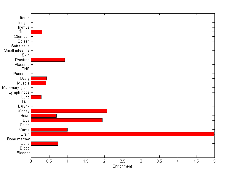 The expression level is normalized with tissue-library size. Each value for a gene in a tissue is a ratio of observed ESTs to the expected one in this tissue. The expected number of ESTs is the product of total ESTs of the gene and the fraction of total ESTs in the tissue among all ESTs in 30 tissues.