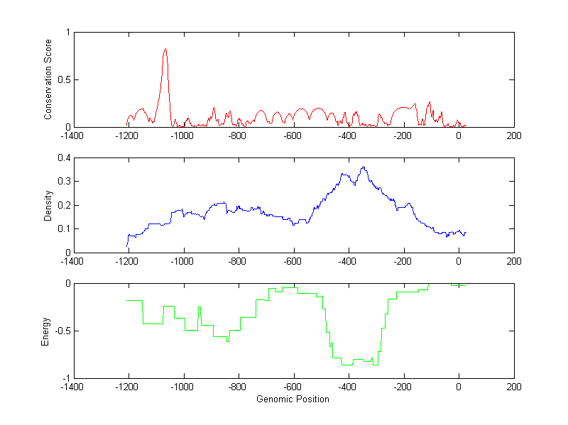 The conservation profile (red curve) is about conservation scores of the promoter sequences. Conservation was determined from an eight-way alignment of human, chimpanzee, dog, mouse, rat, chicken, zebrafish and fugu sequences. The conservation was quantified by a conservation score between 0 and 1, with 1 as highest conservation. The conservation score was obtained from UCSC genome databases.