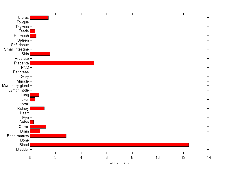 The expression level is normalized with tissue-library size. Each value for a gene in a tissue is a ratio of observed ESTs to the expected one in this tissue. The expected number of ESTs is the product of total ESTs of the gene and the fraction of total ESTs in the tissue among all ESTs in 30 tissues.