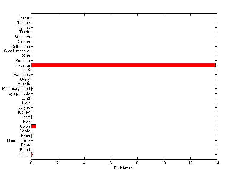 The expression level is normalized with tissue-library size. Each value for a gene in a tissue is a ratio of observed ESTs to the expected one in this tissue. The expected number of ESTs is the product of total ESTs of the gene and the fraction of total ESTs in the tissue among all ESTs in 30 tissues.