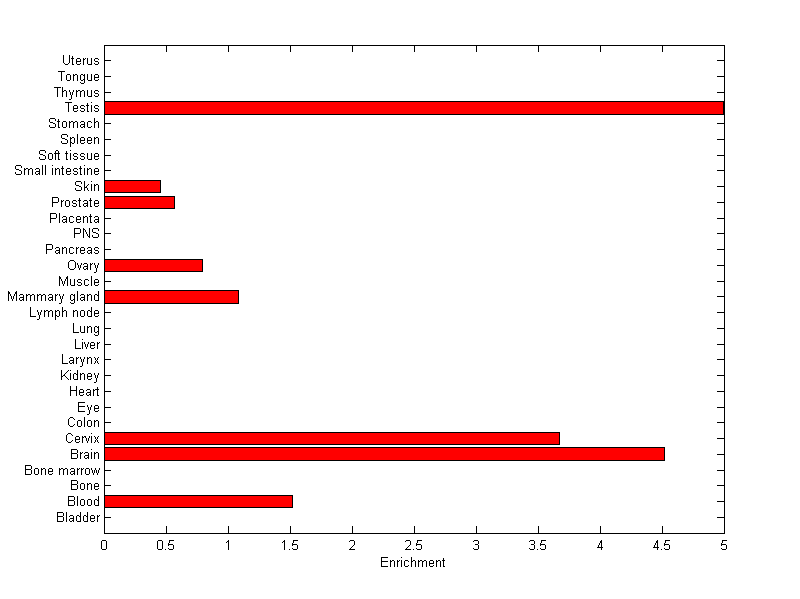 The expression level is normalized with tissue-library size. Each value for a gene in a tissue is a ratio of observed ESTs to the expected one in this tissue. The expected number of ESTs is the product of total ESTs of the gene and the fraction of total ESTs in the tissue among all ESTs in 30 tissues.