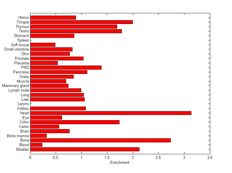 The expression level is normalized with tissue-library size. Each value for a gene in a tissue is a ratio of observed ESTs to the expected one in this tissue. The expected number of ESTs is the product of total ESTs of the gene and the fraction of total ESTs in the tissue among all ESTs in 30 tissues.