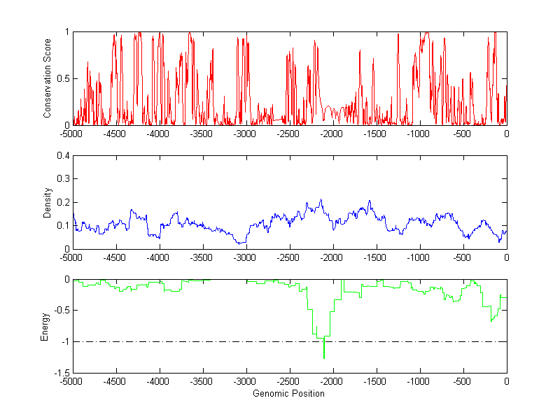 The energy profile (green curve) is about energy for module detection based on TF interaction. The positions with energy less than -1 indicate the existence of CRMs.