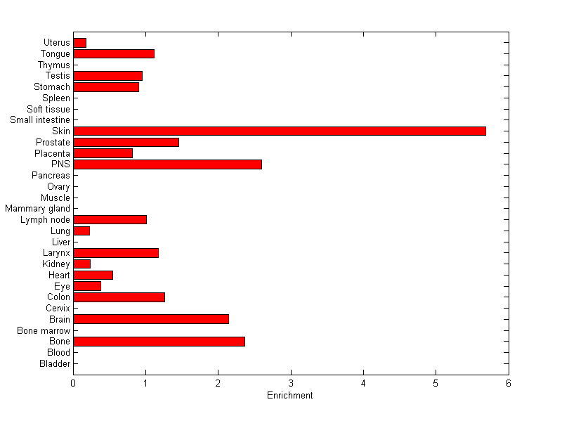 The expression level is normalized with tissue-library size. Each value for a gene in a tissue is a ratio of observed ESTs to the expected one in this tissue. The expected number of ESTs is the product of total ESTs of the gene and the fraction of total ESTs in the tissue among all ESTs in 30 tissues.