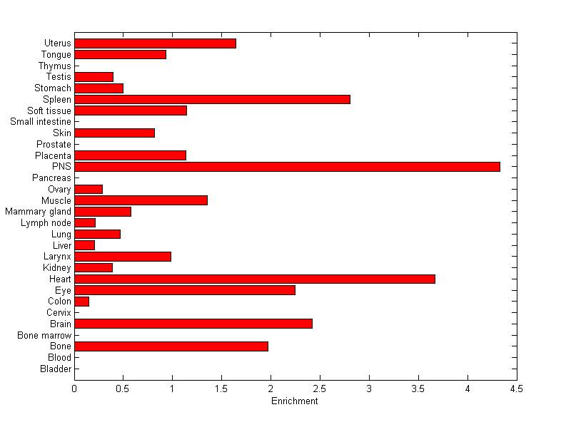 The expression level is normalized with tissue-library size. Each value for a gene in a tissue is a ratio of observed ESTs to the expected one in this tissue. The expected number of ESTs is the product of total ESTs of the gene and the fraction of total ESTs in the tissue among all ESTs in 30 tissues.