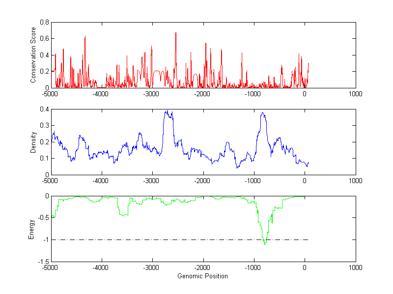 About the profiles: The conservation profile (red curve) is about conservation scores of the promoter sequences. Conservation was determined from an eight-way alignment of human, chimpanzee, dog, mouse, rat, chicken, zebrafish and fugu sequences. The conservation was quantified by a conservation score between 0 and 1, with 1 as highest conservation. The conservation score was obtained from UCSC genome databases. The density profile (blue curve) is about density of all TF binding sites. The energy profile (green curve) is about energy for module detection based on TF interaction. The positions with energy less than -1 indicate the existence of CRMs. Download: Conservation profileDensity profile Energy profile CRM summary |