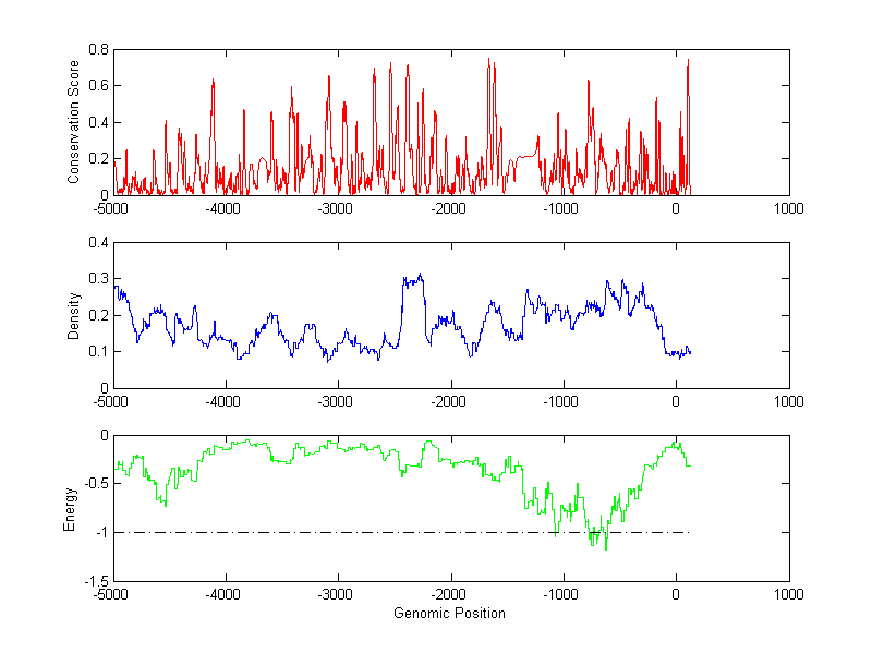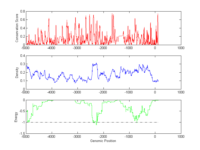 About the profiles: The conservation profile (red curve) is about conservation scores of the promoter sequences. Conservation was determined from an eight-way alignment of human, chimpanzee, dog, mouse, rat, chicken, zebrafish and fugu sequences. The conservation was quantified by a conservation score between 0 and 1, with 1 as highest conservation. The conservation score was obtained from UCSC genome databases. The density profile (blue curve) is about density of all TF binding sites. The energy profile (green curve) is about energy for module detection based on TF interaction. The positions with energy less than -1 indicate the existence of CRMs. Download: Conservation profileDensity profile Energy profile CRM summary |