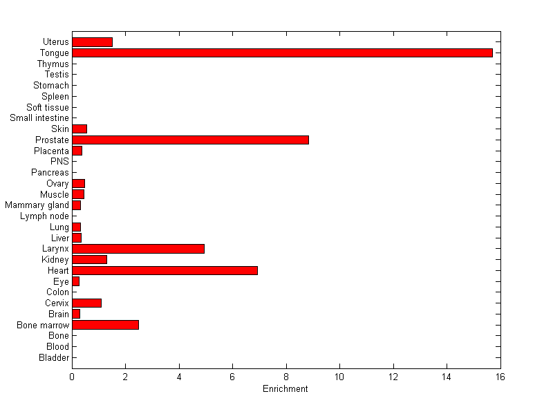 About the profile: The expression level is normalized with tissue-library size. Each value for a gene in a tissue is a ratio of observed ESTs to the expected one in this tissue. The expected number of ESTs is the product of total ESTs of the gene and the fraction of total ESTs in the tissue among all ESTs in 30 tissues. Summary: This gene is preferentially expressed in [heart, prostate, tongue] Download: |