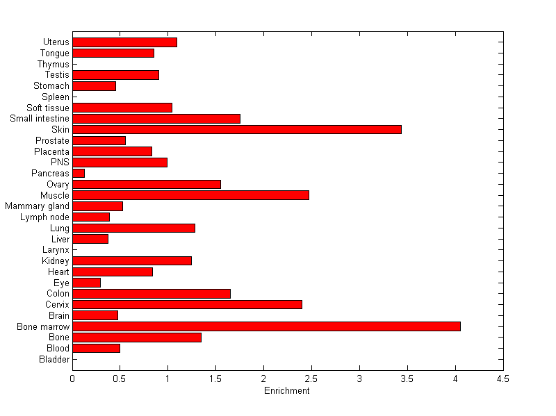 The expression level is normalized with tissue-library size. Each value for a gene in a tissue is a ratio of observed ESTs to the expected one in this tissue. The expected number of ESTs is the product of total ESTs of the gene and the fraction of total ESTs in the tissue among all ESTs in 30 tissues.