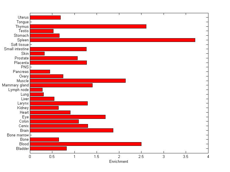 The expression level is normalized with tissue-library size. Each value for a gene in a tissue is a ratio of observed ESTs to the expected one in this tissue. The expected number of ESTs is the product of total ESTs of the gene and the fraction of total ESTs in the tissue among all ESTs in 30 tissues.