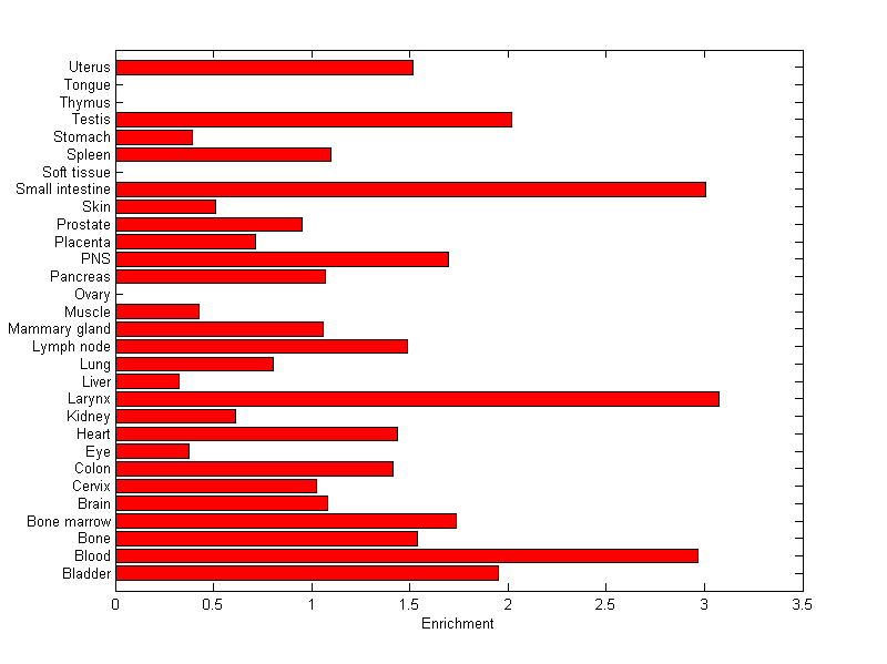 The expression level is normalized with tissue-library size. Each value for a gene in a tissue is a ratio of observed ESTs to the expected one in this tissue. The expected number of ESTs is the product of total ESTs of the gene and the fraction of total ESTs in the tissue among all ESTs in 30 tissues.