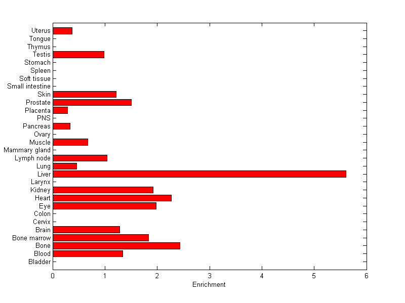 The expression level is normalized with tissue-library size. Each value for a gene in a tissue is a ratio of observed ESTs to the expected one in this tissue. The expected number of ESTs is the product of total ESTs of the gene and the fraction of total ESTs in the tissue among all ESTs in 30 tissues.