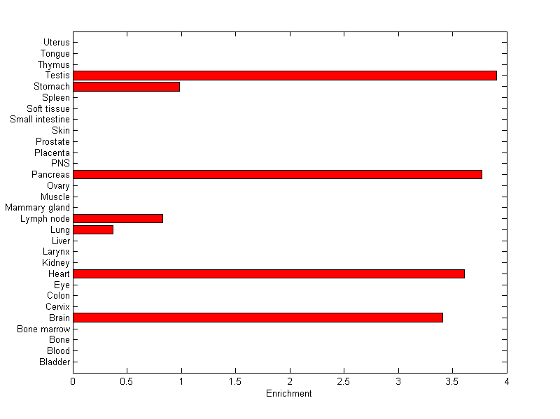 The expression level is normalized with tissue-library size. Each value for a gene in a tissue is a ratio of observed ESTs to the expected one in this tissue. The expected number of ESTs is the product of total ESTs of the gene and the fraction of total ESTs in the tissue among all ESTs in 30 tissues.