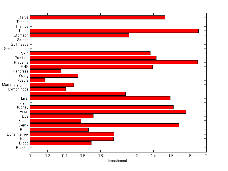 The expression level is normalized with tissue-library size. Each value for a gene in a tissue is a ratio of observed ESTs to the expected one in this tissue. The expected number of ESTs is the product of total ESTs of the gene and the fraction of total ESTs in the tissue among all ESTs in 30 tissues.
