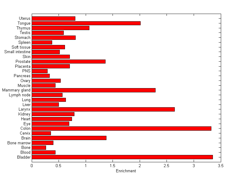 The expression level is normalized with tissue-library size. Each value for a gene in a tissue is a ratio of observed ESTs to the expected one in this tissue. The expected number of ESTs is the product of total ESTs of the gene and the fraction of total ESTs in the tissue among all ESTs in 30 tissues.
