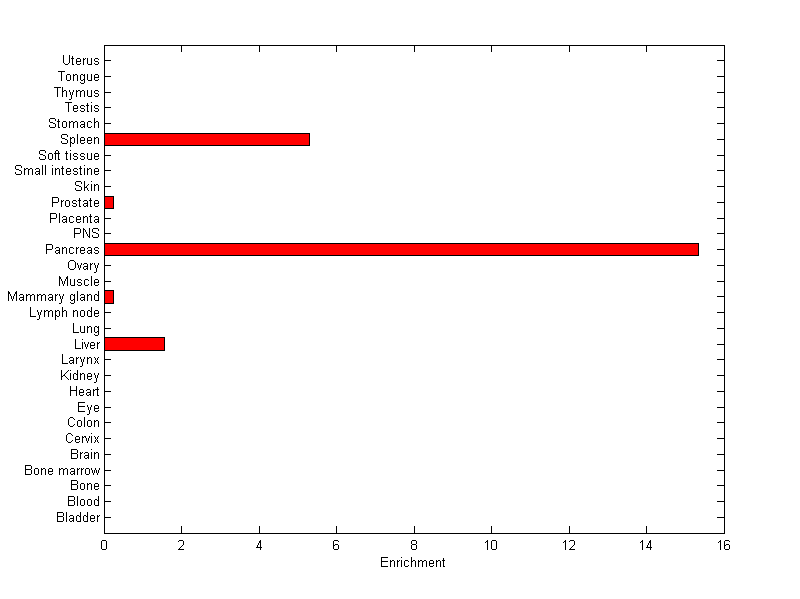 The expression level is normalized with tissue-library size. Each value for a gene in a tissue is a ratio of observed ESTs to the expected one in this tissue. The expected number of ESTs is the product of total ESTs of the gene and the fraction of total ESTs in the tissue among all ESTs in 30 tissues.