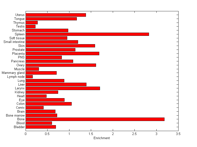 The expression level is normalized with tissue-library size. Each value for a gene in a tissue is a ratio of observed ESTs to the expected one in this tissue. The expected number of ESTs is the product of total ESTs of the gene and the fraction of total ESTs in the tissue among all ESTs in 30 tissues.