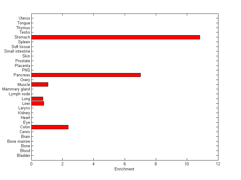 About the profile: The expression level is normalized with tissue-library size. Each value for a gene in a tissue is a ratio of observed ESTs to the expected one in this tissue. The expected number of ESTs is the product of total ESTs of the gene and the fraction of total ESTs in the tissue among all ESTs in 30 tissues. Summary: This gene is preferentially expressed in [pancreas, stomach] Download: |