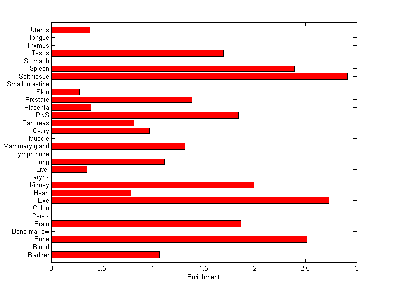 The expression level is normalized with tissue-library size. Each value for a gene in a tissue is a ratio of observed ESTs to the expected one in this tissue. The expected number of ESTs is the product of total ESTs of the gene and the fraction of total ESTs in the tissue among all ESTs in 30 tissues.