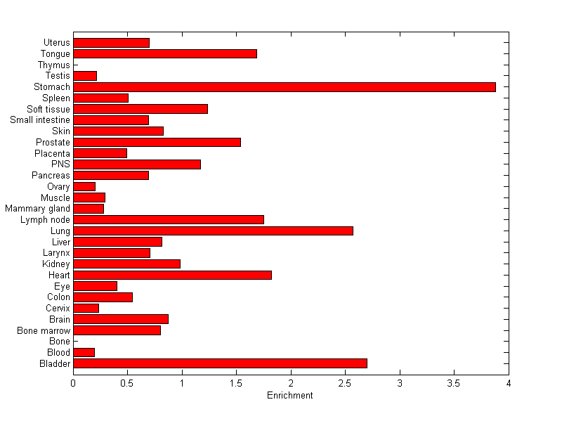 The expression level is normalized with tissue-library size. Each value for a gene in a tissue is a ratio of observed ESTs to the expected one in this tissue. The expected number of ESTs is the product of total ESTs of the gene and the fraction of total ESTs in the tissue among all ESTs in 30 tissues.