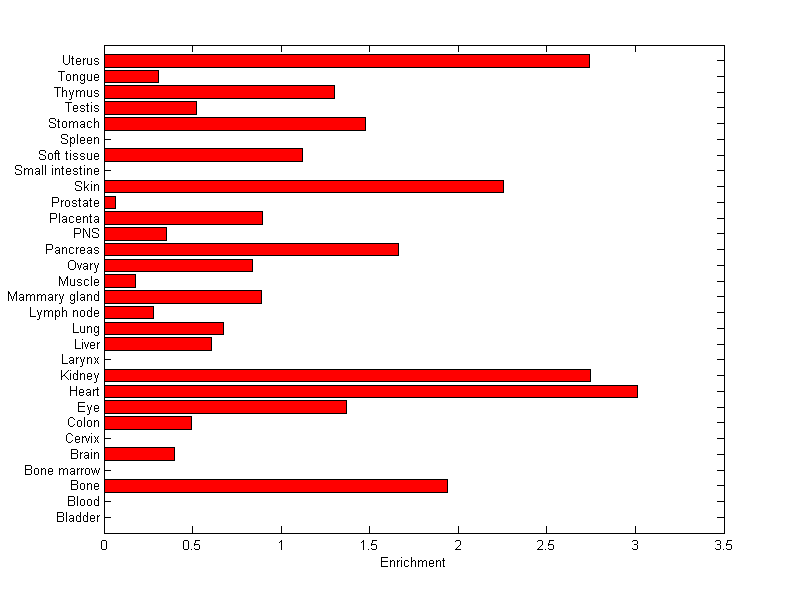 The expression level is normalized with tissue-library size. Each value for a gene in a tissue is a ratio of observed ESTs to the expected one in this tissue. The expected number of ESTs is the product of total ESTs of the gene and the fraction of total ESTs in the tissue among all ESTs in 30 tissues.