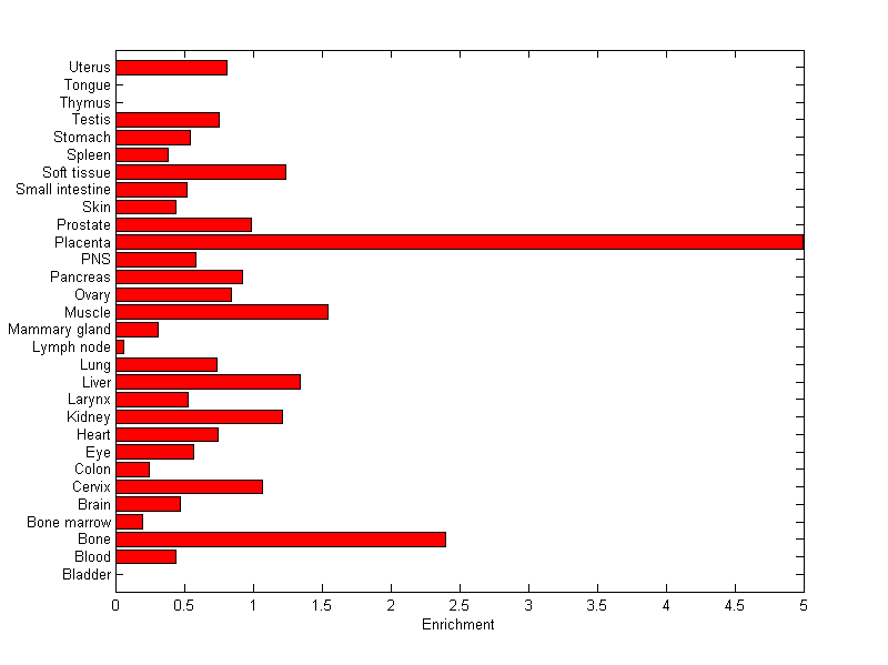 The expression level is normalized with tissue-library size. Each value for a gene in a tissue is a ratio of observed ESTs to the expected one in this tissue. The expected number of ESTs is the product of total ESTs of the gene and the fraction of total ESTs in the tissue among all ESTs in 30 tissues.