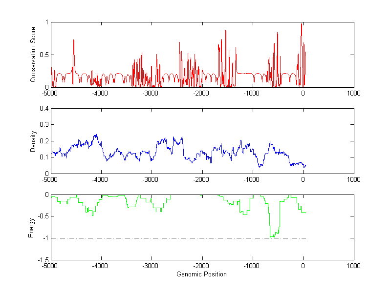 The energy profile (green curve) is about energy for module detection based on TF interaction. The positions with energy less than -1 indicate the existence of CRMs.