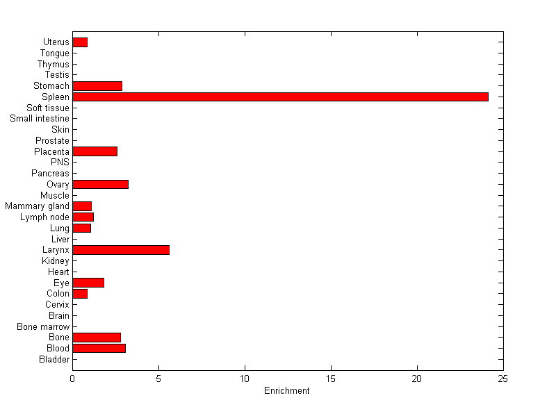 The expression level is normalized with tissue-library size. Each value for a gene in a tissue is a ratio of observed ESTs to the expected one in this tissue. The expected number of ESTs is the product of total ESTs of the gene and the fraction of total ESTs in the tissue among all ESTs in 30 tissues.