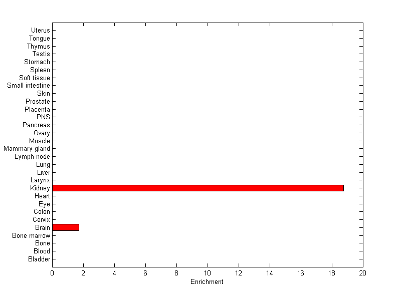 About the profile: The expression level is normalized with tissue-library size. Each value for a gene in a tissue is a ratio of observed ESTs to the expected one in this tissue. The expected number of ESTs is the product of total ESTs of the gene and the fraction of total ESTs in the tissue among all ESTs in 30 tissues. Summary: This gene is preferentially expressed in [kidney] Download: |