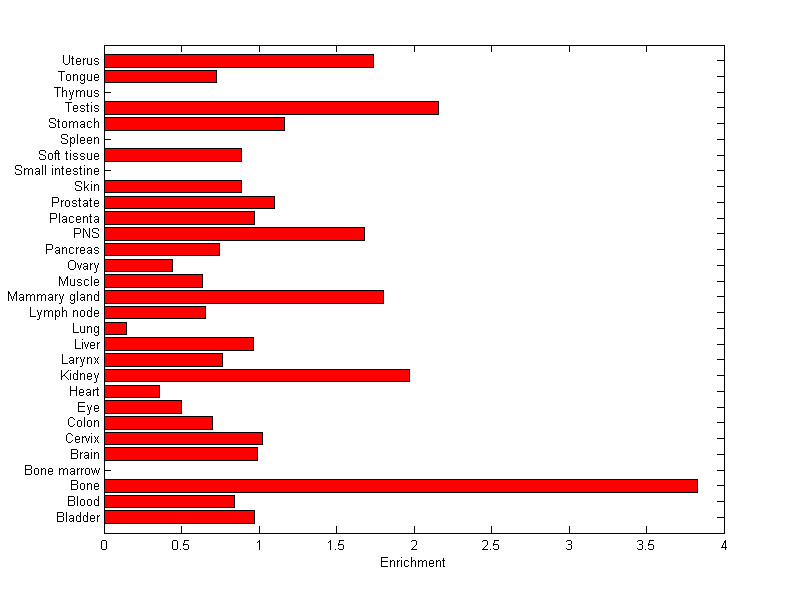 The expression level is normalized with tissue-library size. Each value for a gene in a tissue is a ratio of observed ESTs to the expected one in this tissue. The expected number of ESTs is the product of total ESTs of the gene and the fraction of total ESTs in the tissue among all ESTs in 30 tissues.