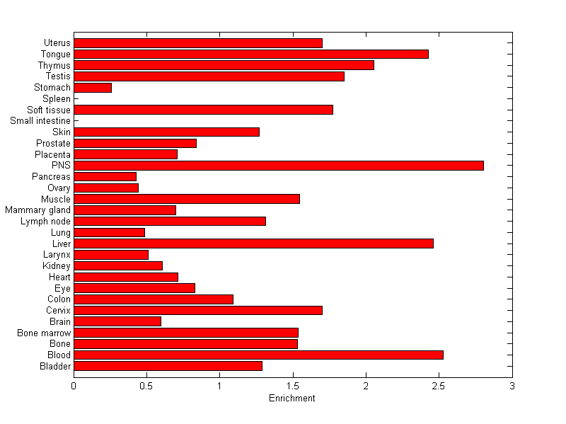 The expression level is normalized with tissue-library size. Each value for a gene in a tissue is a ratio of observed ESTs to the expected one in this tissue. The expected number of ESTs is the product of total ESTs of the gene and the fraction of total ESTs in the tissue among all ESTs in 30 tissues.