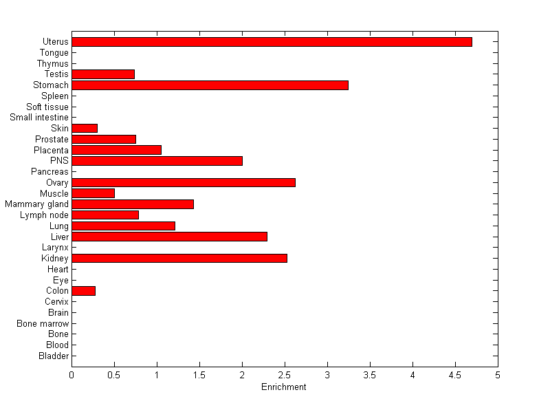 The expression level is normalized with tissue-library size. Each value for a gene in a tissue is a ratio of observed ESTs to the expected one in this tissue. The expected number of ESTs is the product of total ESTs of the gene and the fraction of total ESTs in the tissue among all ESTs in 30 tissues.