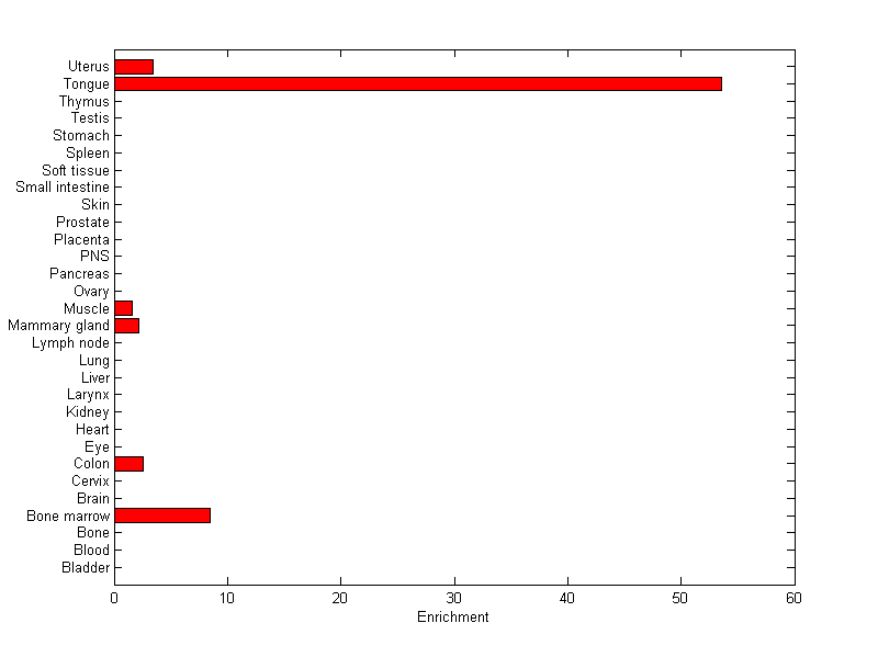 The expression level is normalized with tissue-library size. Each value for a gene in a tissue is a ratio of observed ESTs to the expected one in this tissue. The expected number of ESTs is the product of total ESTs of the gene and the fraction of total ESTs in the tissue among all ESTs in 30 tissues.