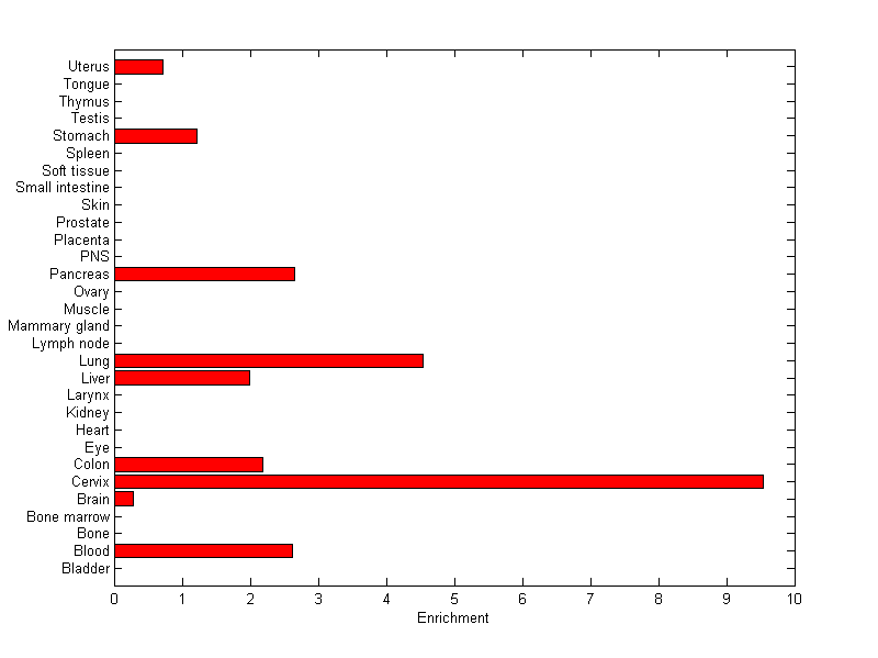 The expression level is normalized with tissue-library size. Each value for a gene in a tissue is a ratio of observed ESTs to the expected one in this tissue. The expected number of ESTs is the product of total ESTs of the gene and the fraction of total ESTs in the tissue among all ESTs in 30 tissues.
