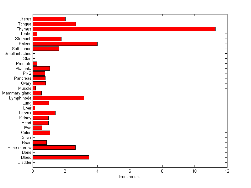 The expression level is normalized with tissue-library size. Each value for a gene in a tissue is a ratio of observed ESTs to the expected one in this tissue. The expected number of ESTs is the product of total ESTs of the gene and the fraction of total ESTs in the tissue among all ESTs in 30 tissues.
