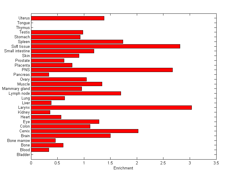 The expression level is normalized with tissue-library size. Each value for a gene in a tissue is a ratio of observed ESTs to the expected one in this tissue. The expected number of ESTs is the product of total ESTs of the gene and the fraction of total ESTs in the tissue among all ESTs in 30 tissues.