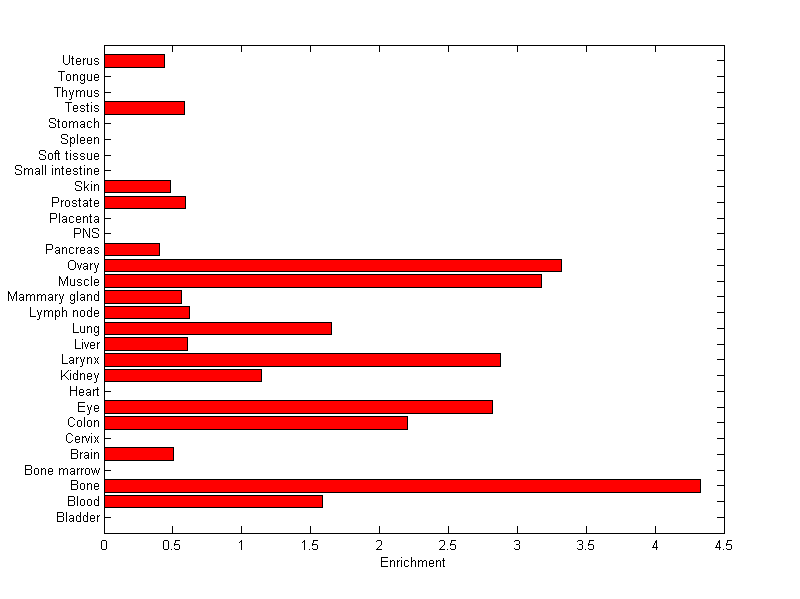 The expression level is normalized with tissue-library size. Each value for a gene in a tissue is a ratio of observed ESTs to the expected one in this tissue. The expected number of ESTs is the product of total ESTs of the gene and the fraction of total ESTs in the tissue among all ESTs in 30 tissues.