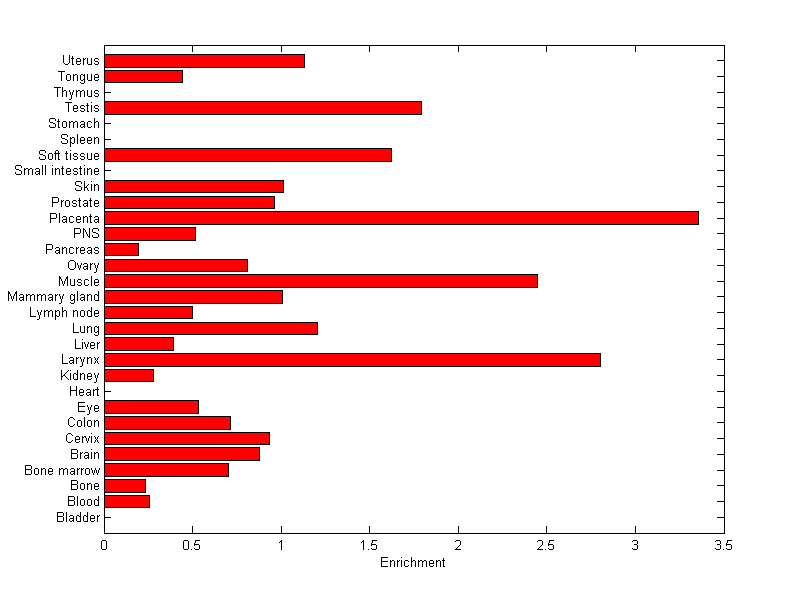 The expression level is normalized with tissue-library size. Each value for a gene in a tissue is a ratio of observed ESTs to the expected one in this tissue. The expected number of ESTs is the product of total ESTs of the gene and the fraction of total ESTs in the tissue among all ESTs in 30 tissues.