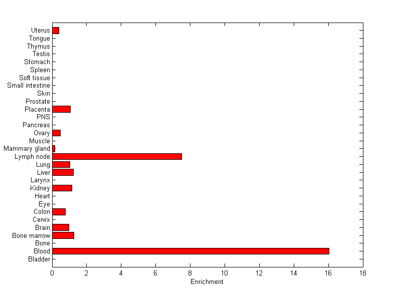 The expression level is normalized with tissue-library size. Each value for a gene in a tissue is a ratio of observed ESTs to the expected one in this tissue. The expected number of ESTs is the product of total ESTs of the gene and the fraction of total ESTs in the tissue among all ESTs in 30 tissues.