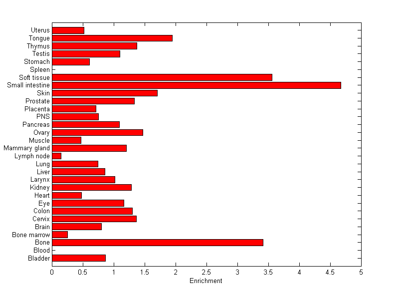 The expression level is normalized with tissue-library size. Each value for a gene in a tissue is a ratio of observed ESTs to the expected one in this tissue. The expected number of ESTs is the product of total ESTs of the gene and the fraction of total ESTs in the tissue among all ESTs in 30 tissues.