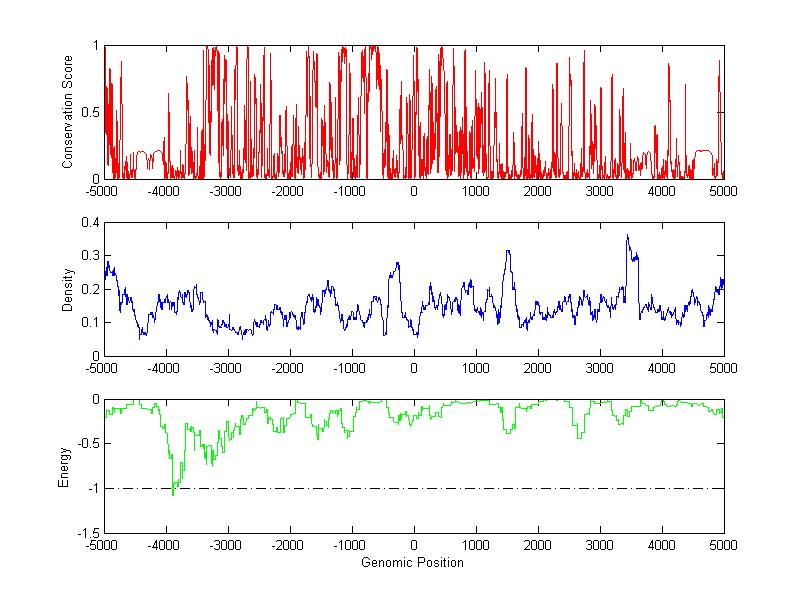 The energy profile (green curve) is about energy for module detection based on TF interaction. The positions with energy less than -1 indicate the existence of CRMs.