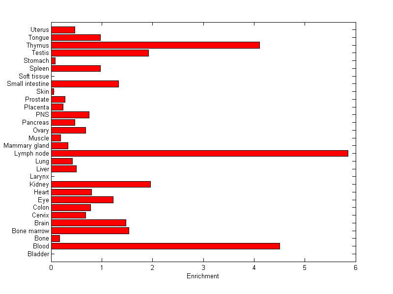 The expression level is normalized with tissue-library size. Each value for a gene in a tissue is a ratio of observed ESTs to the expected one in this tissue. The expected number of ESTs is the product of total ESTs of the gene and the fraction of total ESTs in the tissue among all ESTs in 30 tissues.