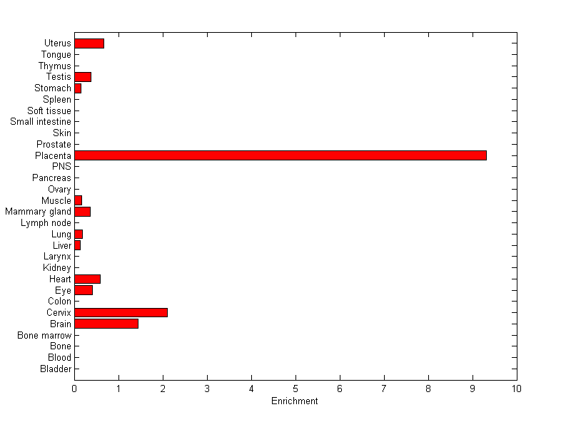 The expression level is normalized with tissue-library size. Each value for a gene in a tissue is a ratio of observed ESTs to the expected one in this tissue. The expected number of ESTs is the product of total ESTs of the gene and the fraction of total ESTs in the tissue among all ESTs in 30 tissues.
