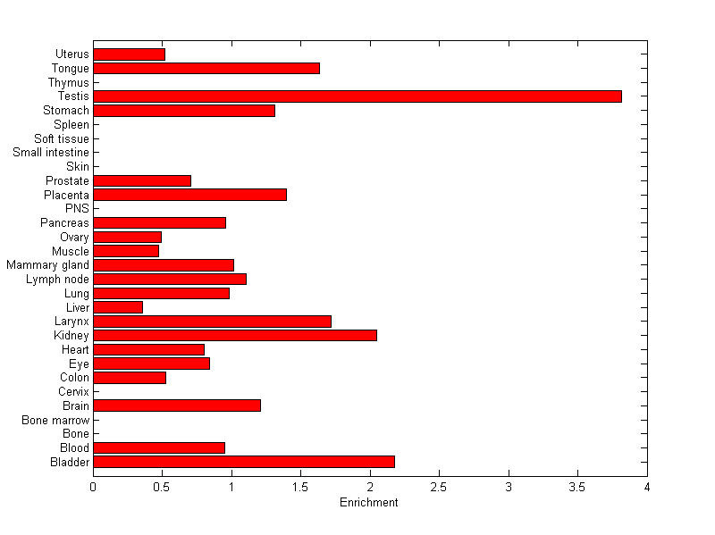 The expression level is normalized with tissue-library size. Each value for a gene in a tissue is a ratio of observed ESTs to the expected one in this tissue. The expected number of ESTs is the product of total ESTs of the gene and the fraction of total ESTs in the tissue among all ESTs in 30 tissues.