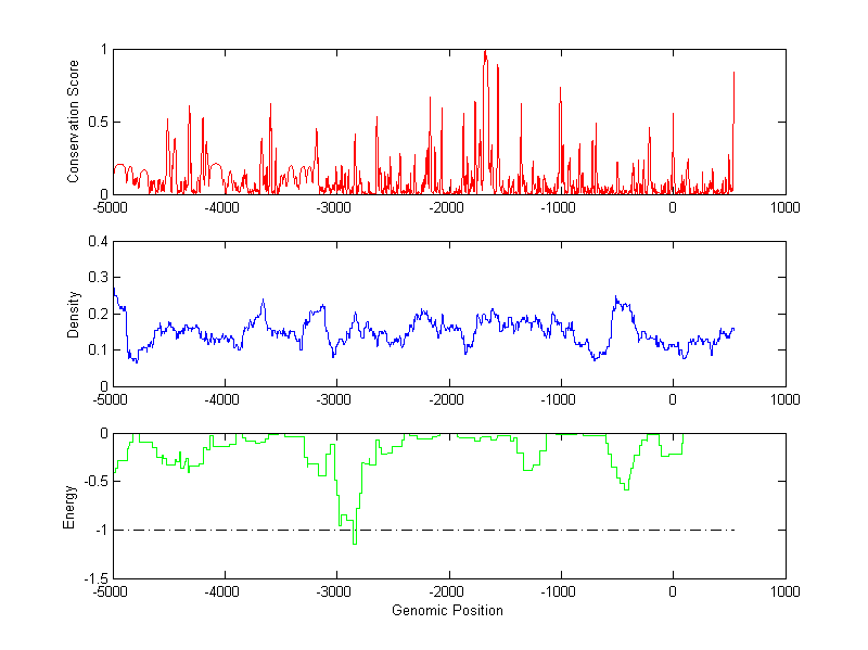 About the profiles: The conservation profile (red curve) is about conservation scores of the promoter sequences. Conservation was determined from an eight-way alignment of human, chimpanzee, dog, mouse, rat, chicken, zebrafish and fugu sequences. The conservation was quantified by a conservation score between 0 and 1, with 1 as highest conservation. The conservation score was obtained from UCSC genome databases. The density profile (blue curve) is about density of all TF binding sites. The energy profile (green curve) is about energy for module detection based on TF interaction. The positions with energy less than -1 indicate the existence of CRMs. Download: Conservation profileDensity profile Energy profile CRM summary |