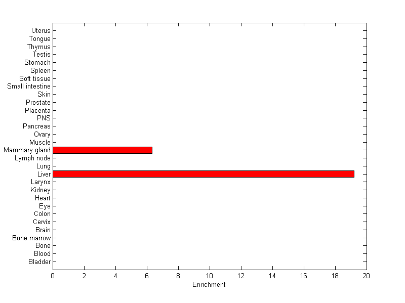 About the profile: The expression level is normalized with tissue-library size. Each value for a gene in a tissue is a ratio of observed ESTs to the expected one in this tissue. The expected number of ESTs is the product of total ESTs of the gene and the fraction of total ESTs in the tissue among all ESTs in 30 tissues. Summary: This gene is preferentially expressed in [liver, mammary_gland] Download: |